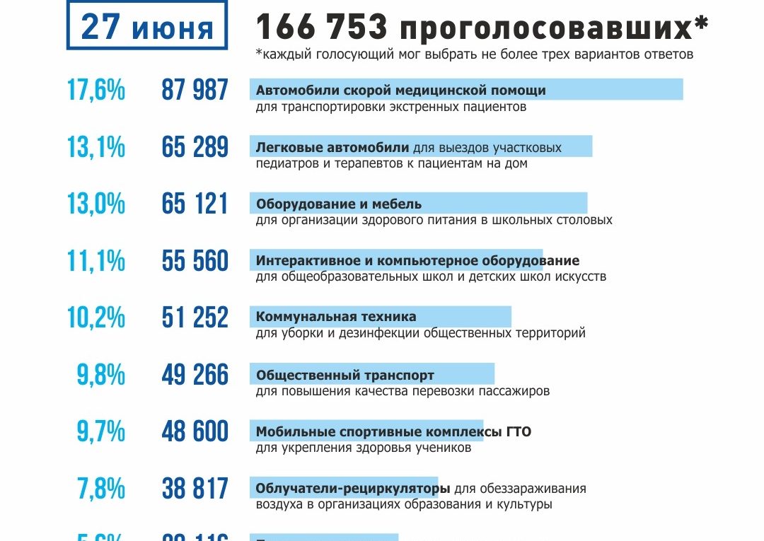Пока тенденция очевидная – жители региона больше всего голосов отдают за транспорт для медицинских учреждений. Голосование продлится до 1 июля включительно! Как отметил Губернатор РО В.Ю. Голубев, это решение о дополнительном направлении 500 млн. рублей он принял как еще одну меру для преодоления последствий пандемии коронавируса. А вынесена повестка из десяти вопросов на голосование всех…