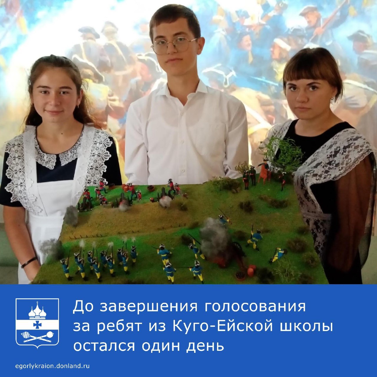 Ребята из Куго-Еейской школы заняли первое место во Всероссийском конкурсе объемных макетов Российского движения школьников (РДШ) «Полтавская битва» Ученики Арзуман Мавлюдов, Диана Мавлюдова, Елизавета Матюшенко под руководством своего наставника и руководителя кружка В.Н. Гнида создали диораму одного из эпизодов Полтавской битвы. Объёмный макет делали специально для конкурса, который еще летом объявило РДШ. Информация пришла в…