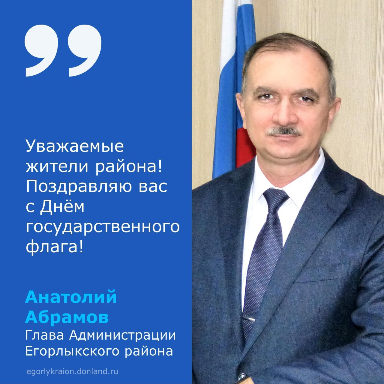 🎉Уважаемые жители Егорлыкского района! От всей души поздравляю вас с Днём Государственного флага Российской Федерации! 🇷🇺Под флагом родной страны все мы ощущаем себя единым и неделимым народом. Триколор – не просто государственный символ. В нем гораздо больше значений – и каждое из них мы ощущаем сердцем. Флаг России олицетворяет масштабную историю страны, её великую культуру…