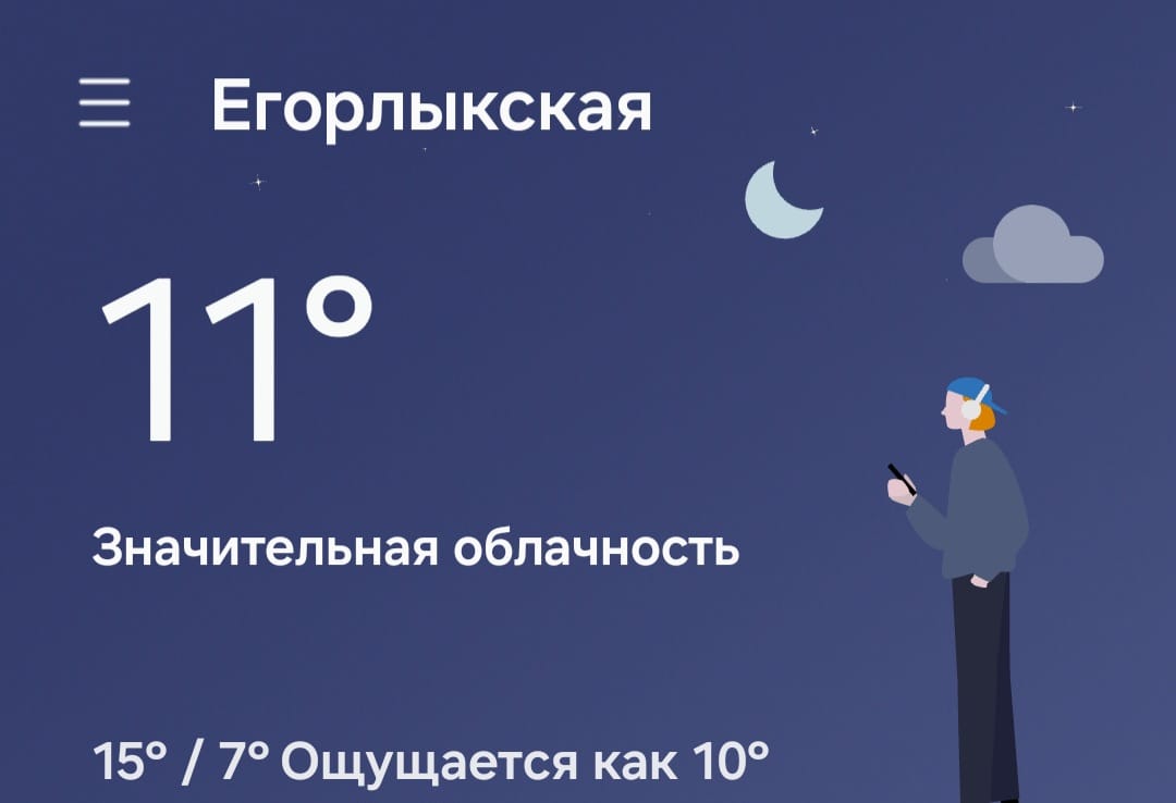По данным сервиса Gismeteo, 20 ноября 2025 года в станице Егорлыкской ожидается следующая погода: Температура: днём около +15 °C, ночью — понижение до +10 °C. Ветер: слабый до умеренного, юго‑западный, со скоростью 3–5 м/с. Давление: стабильное, около 757 мм рт. ст. Осадки: не ожидаются. Влажность воздуха: 75–85%. Общий характер дня: пасмурный, с редкими прояснениями. ФОТО: скриншот виджета погоды с телефона ▶️ Дети и взрослые Егорлыкского района объединились для повышения безопасности на дорогах 👉 zarya-egorlik.ru