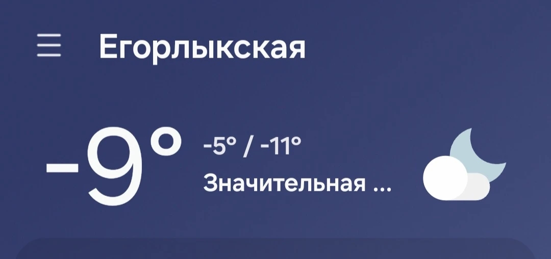 По данным сервиса Gismeteo, 26 декабря 2025 года в станице Егорлыкской ожидается следующая погода: Температура: утром около -11°C, ночью — -1°C. Ветер: юго-западной, со скоростью 5–11 м/с. Давление: около 751 мм рт. ст. Осадки: пасмурно Влажность воздуха: 75 % Общая характеристика дня: холодно, одевайтесь теплее ФОТО: скриншот виджета погоды с телефона ❗ПОДПИСАТЬСЯ НА КАНАЛ «ЗАРИ» В МАХ МОЖНО ПО ССЫЛКЕ:MAX.RU