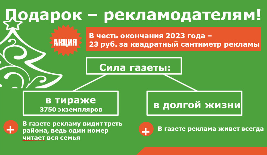 Подарок – рекламодателям! В честь окончания 2023 года – 23 руб. за квадратный сантиметр рекламы! 1️⃣ Расскажите о своем бизнесе в нашем спецпроекте «Подарок – рекламодателям!» по сниженной цене: 23 руб. за 1 кв. см вместо 33 рублей за 1 кв. см. 2️⃣ Минимальный размер рекламного материала – 150 кв. см. Цена этого супер-предложения –…
