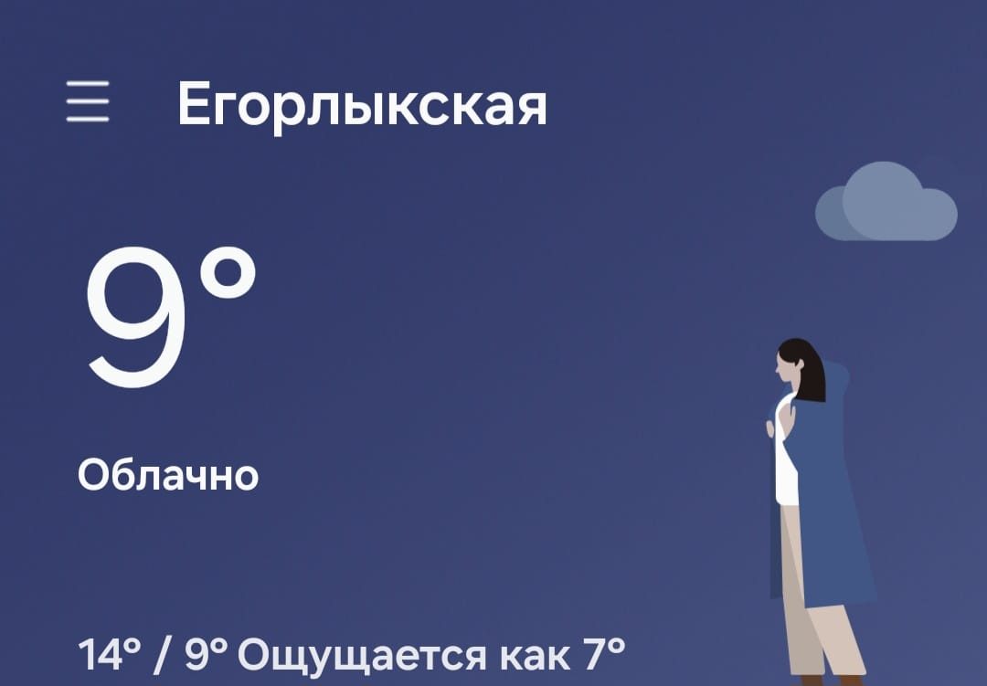 Прогноз составлен с помощью искусственного интеллекта на основе доступных метеорологических моделей. Обратите внимание: погода может меняться в течение дня. В станице Егорлыкской 11 ноября 2025 года прогнозируется следующая погода: ▪️Температура воздуха: днём +14 °C, ночью +9 °C. ▪️Атмосферное давление: 752 мм рт. ст. ▪️Ветер: восточный, со скоростью 4–7 м/с. ▪️Осадки: не ожидаются. Рекомендация: погода комфортная, подойдёт обычная повседневная одежда по сезону. ФОТО: скриншот виджета…