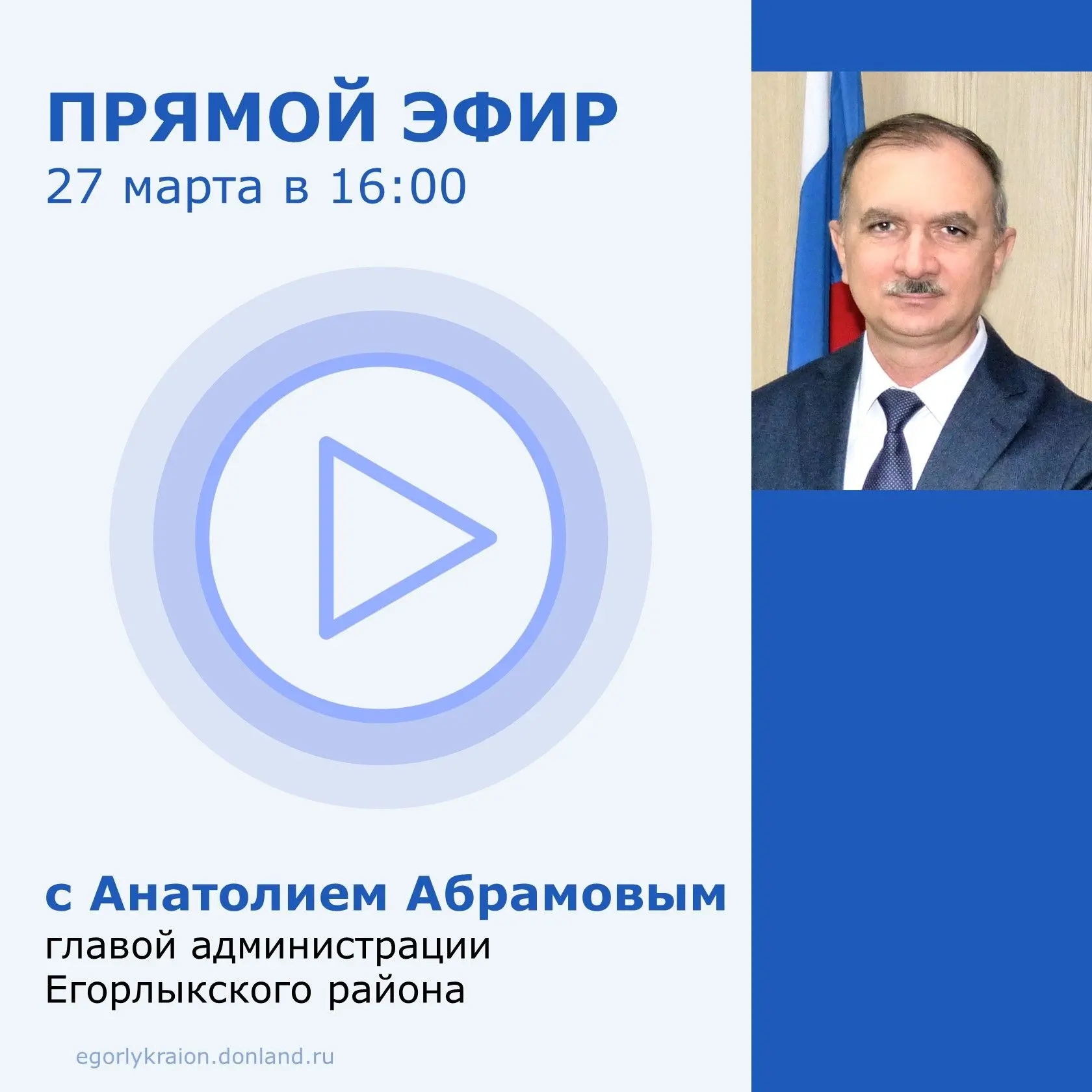 Уважаемые жители Егорлыкского района! ✅ 27 марта 2026 года в 16:00 глава администрации Егорлыкского района Анатолий Абрамов ответит на вопросы граждан в прямом эфире по ссылке: https://vkvideo.ru/live-194269280_456239518?sh=4 ❓Задать все интересующие вас вопросы можно через платформу обратной связи: https://clck.ru/3SfvGB #АдминистрацияЕгорлыкскогорайона #Егорлыкскийрайон #прямаятрансляция #АнатолийАбрамов