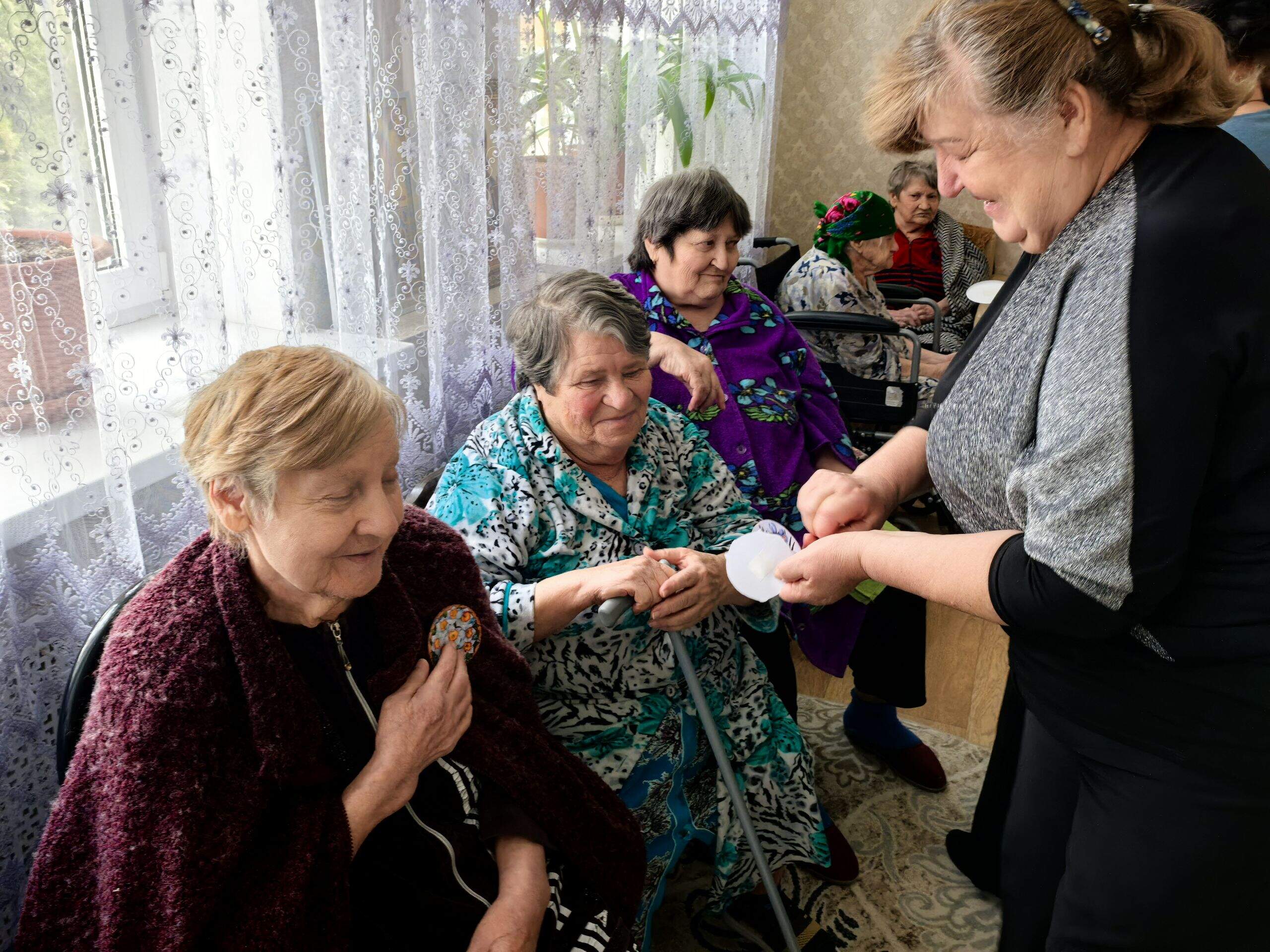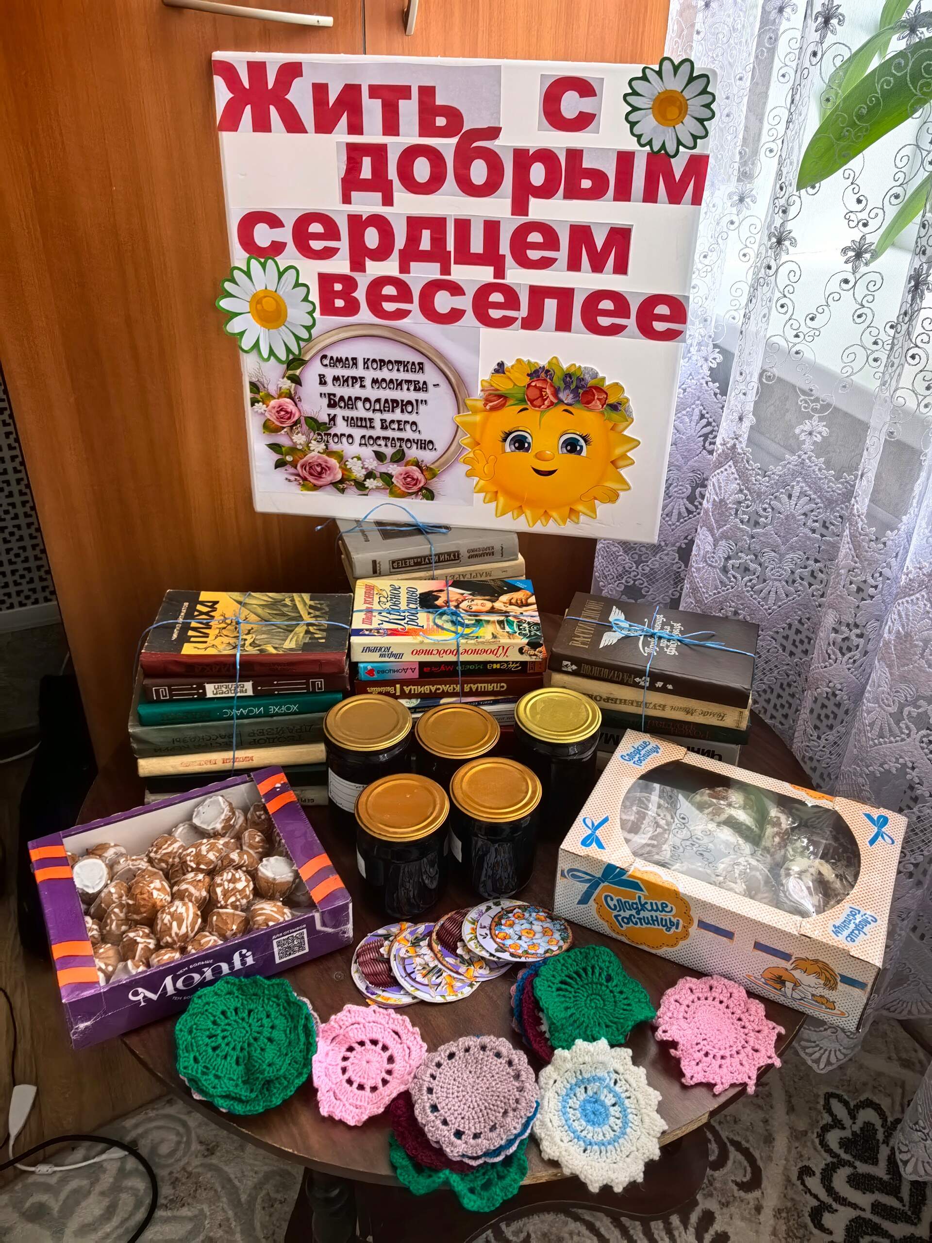 Помимо концерта мы привезли нашим друзьям сладости, домашнее варенье и книги, которые очень любят читать жители «Доброго Света». Также наши рукодельницы приготовили маленькие подарочки, в виде вязанных салфеток под кружечки.
