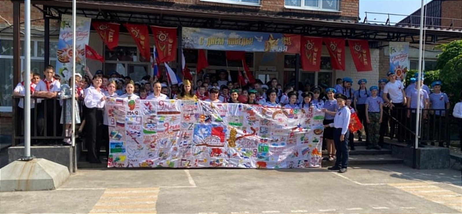В предверии праздника «Знамя Победы», четырехметровое полотно состоящее из 100 детских работ, развернули в школьном дворе ОСОШ №6 им. В.А. Сулева. Это полотно будет передано участникам СВО на передовую.